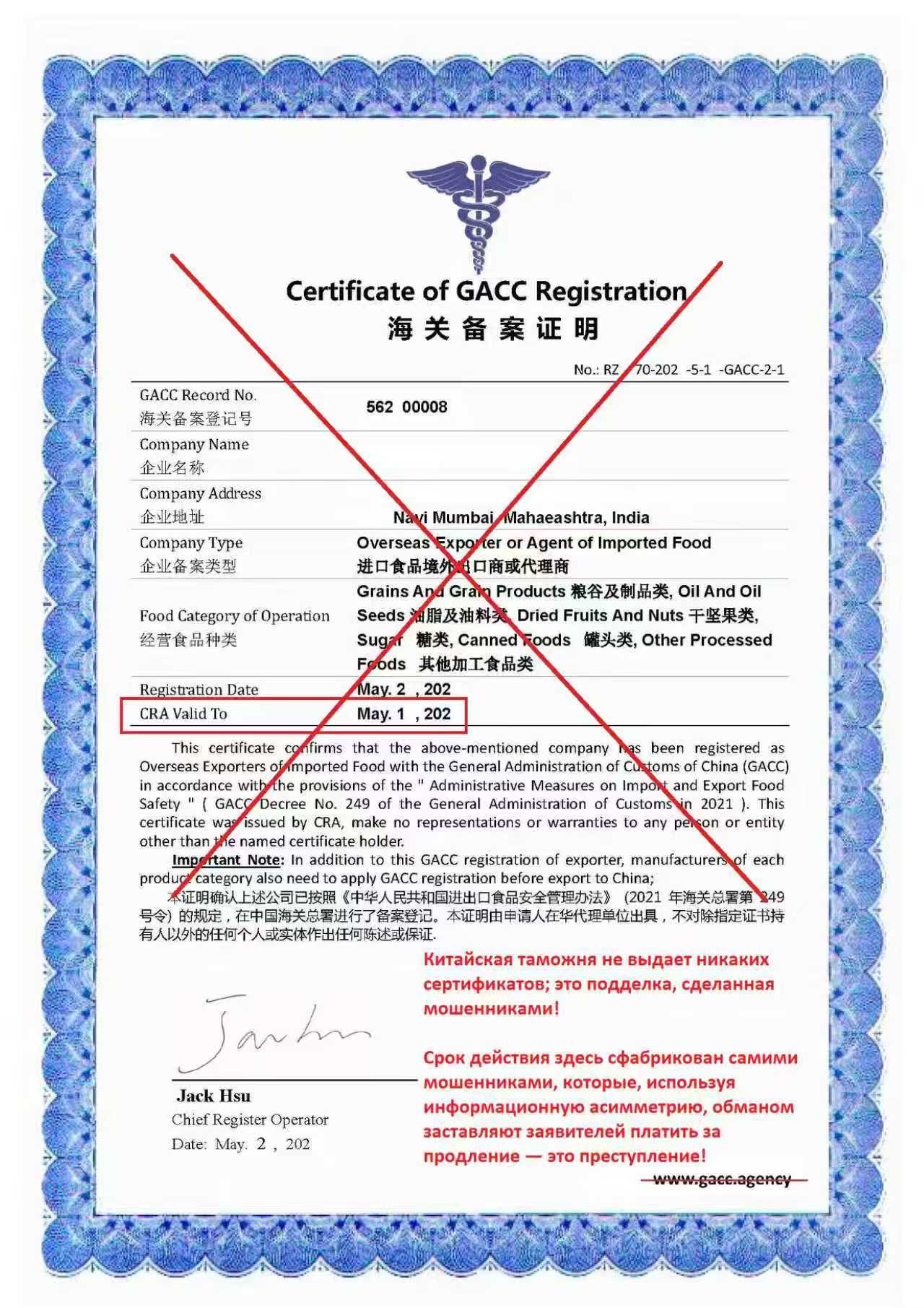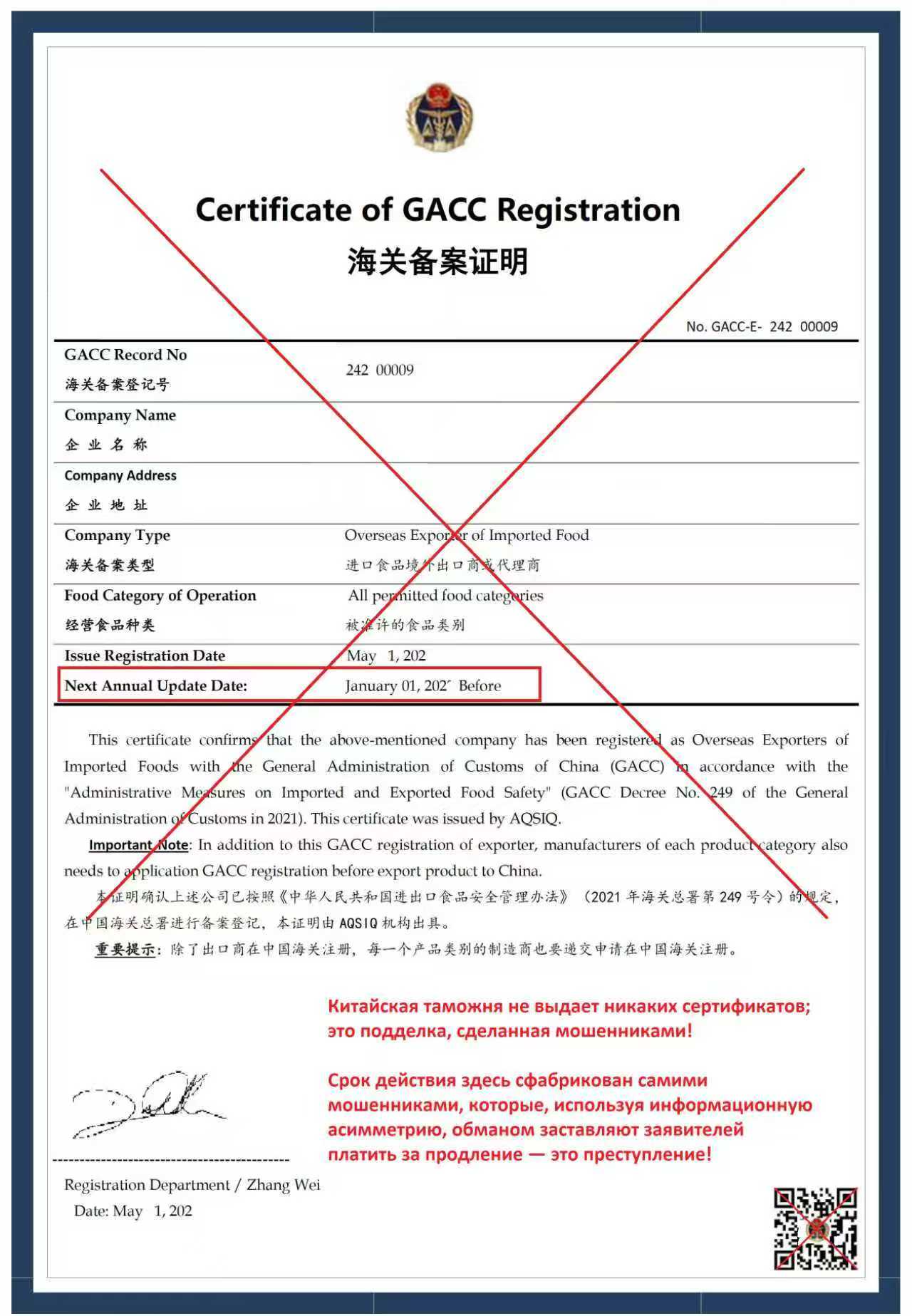 3. Изготовление собственных сертификатов и попытка взимать плату каждый год (китайская таможня не выдает сертификаты, и не существует ограничений по сроку действия для квалификаций регистрации экспортера. Это очевидное уголовное преступление против иностранных заявителей, заключающееся в использовании асимметрии информации)